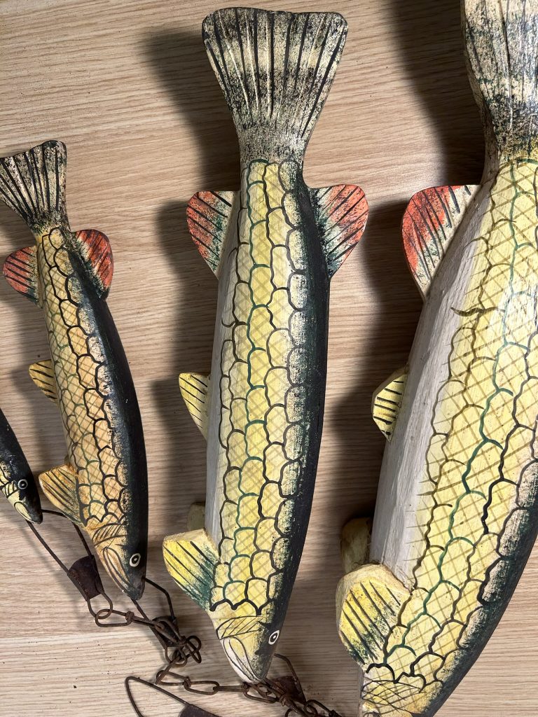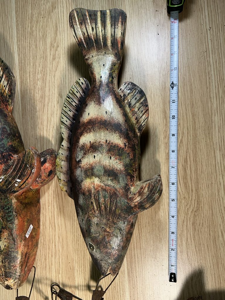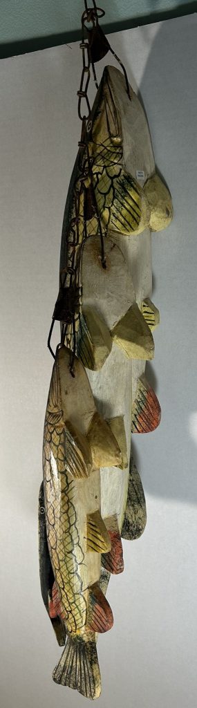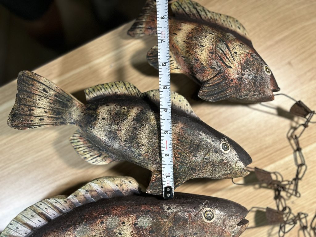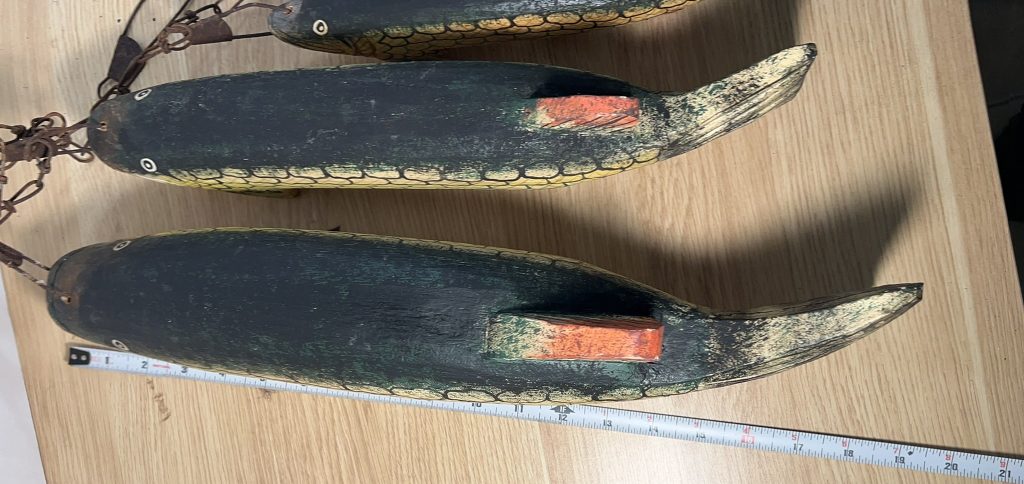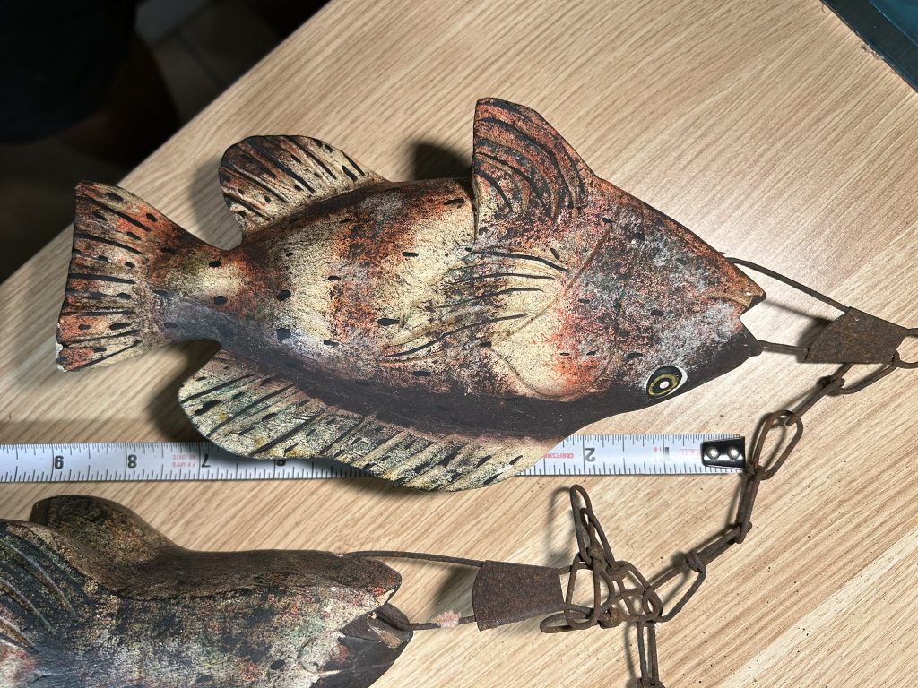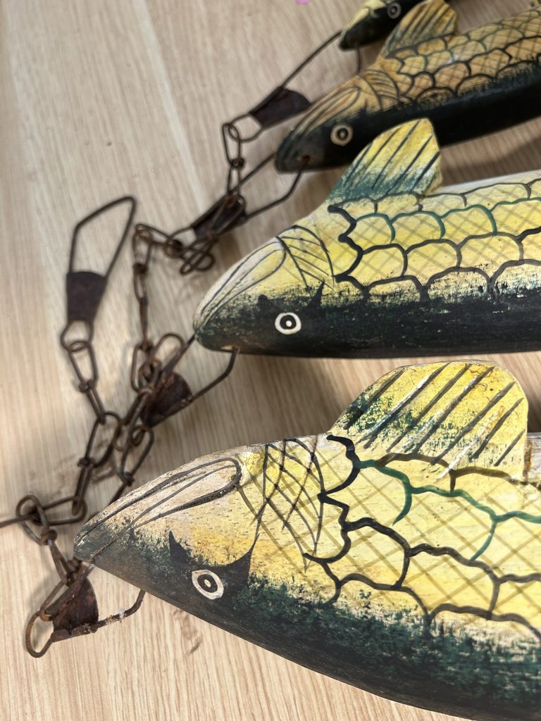 These wooden fish originate from Indonesia. They are hand painted.These were found at an auction in Georgia and although the date they were made is unknown, they are assumed to be old in view of the rusted fishing chains that hold them together. All together, about 20 different sets of fish are available. These would be a great gift for a fisherman in the family. I gave a set to my son after we went out fishing for a day and caught nothing. He was not amused.