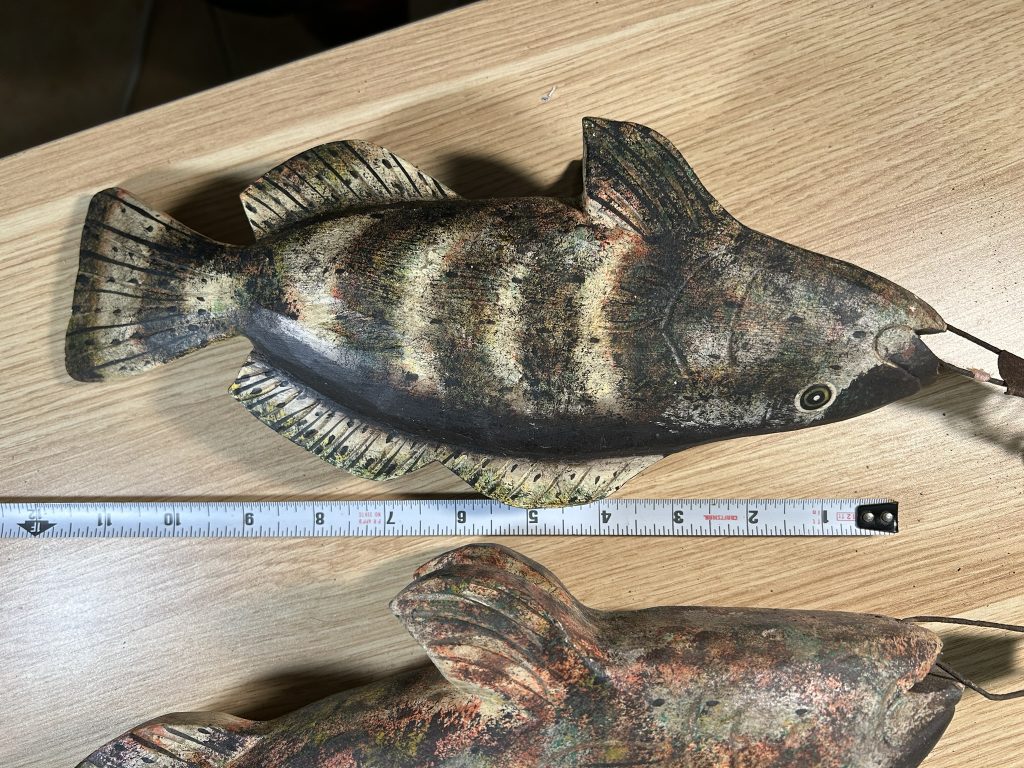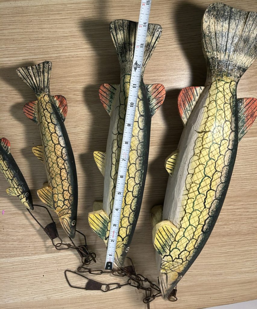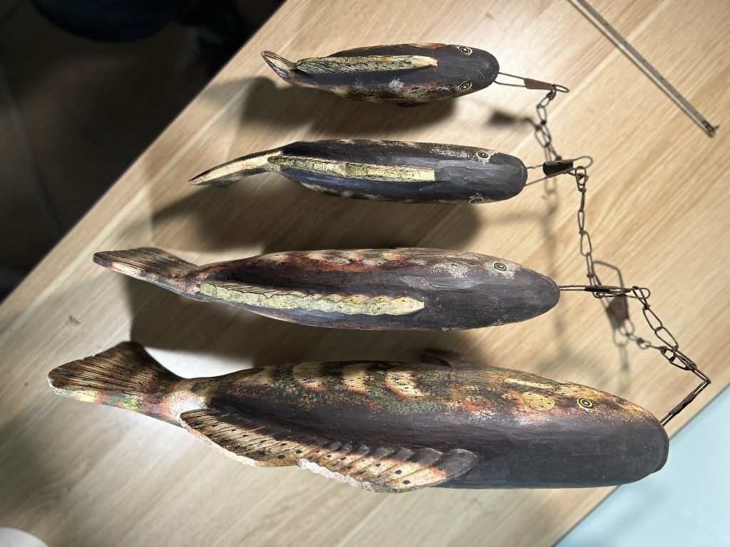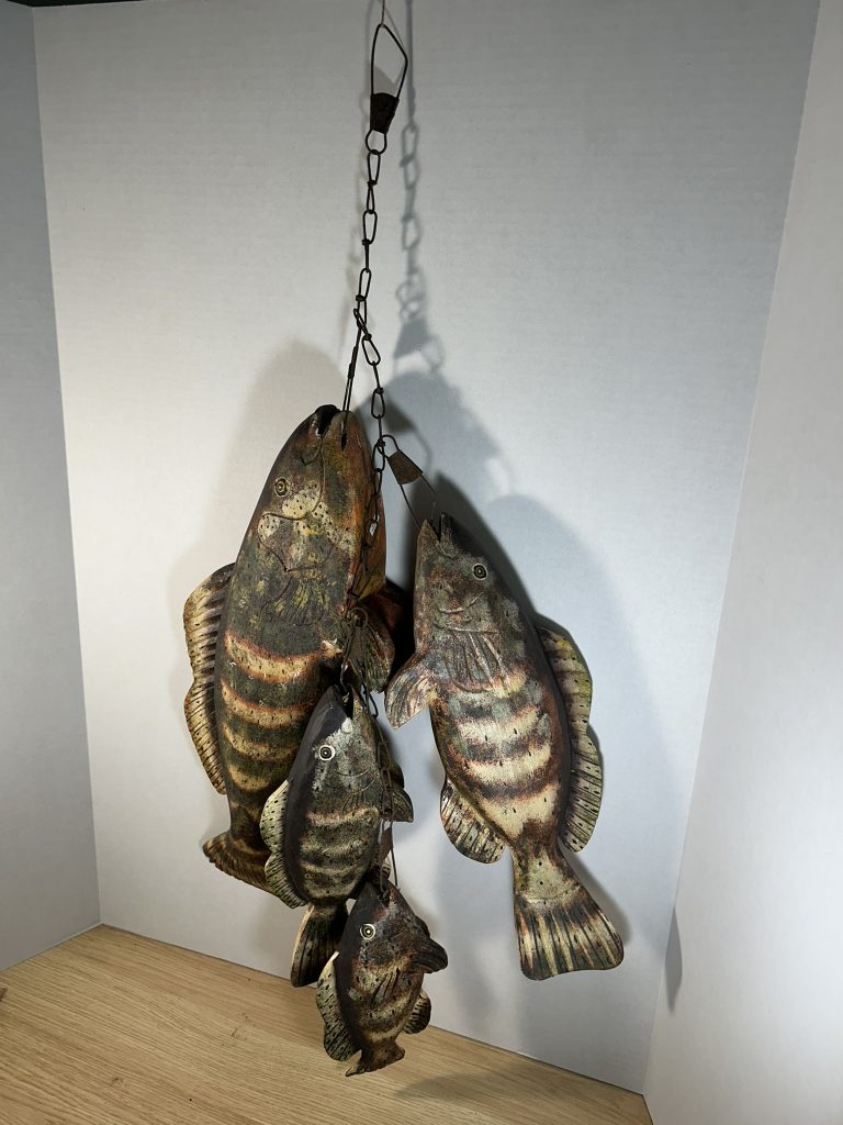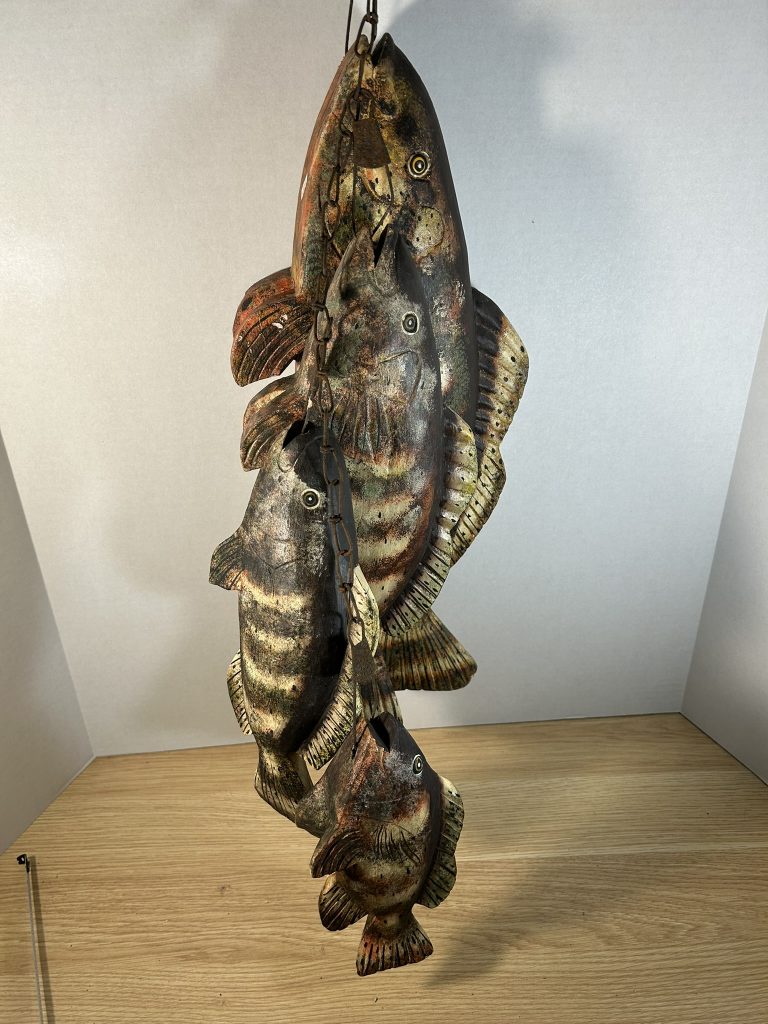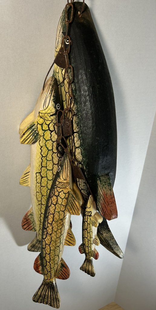 These wooden fish originate from Indonesia. They are hand painted.These were found at an auction in Georgia and although the date they were made is unknown, they are assumed to be old in view of the rusted fishing chains that hold them together. All together, about 20 different sets of fish are available. These would be a great gift for a fisherman in the family. I gave a set to my son after we went out fishing for a day and caught nothing. He was not amused.
