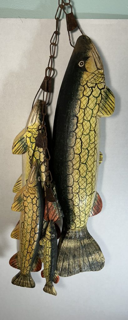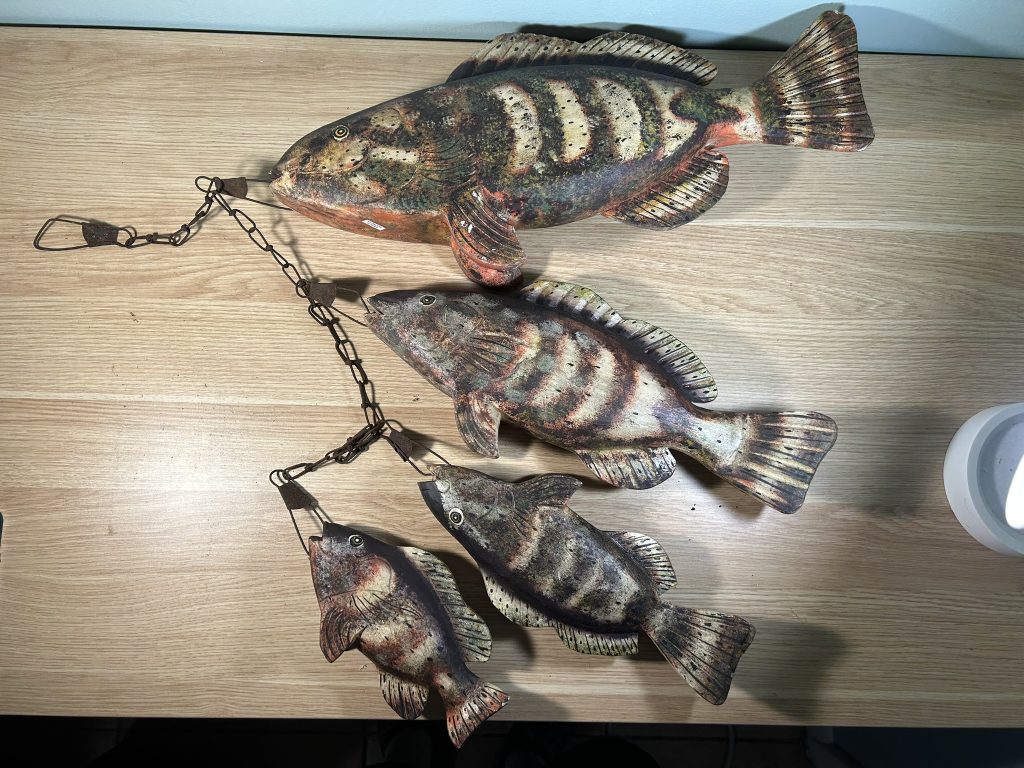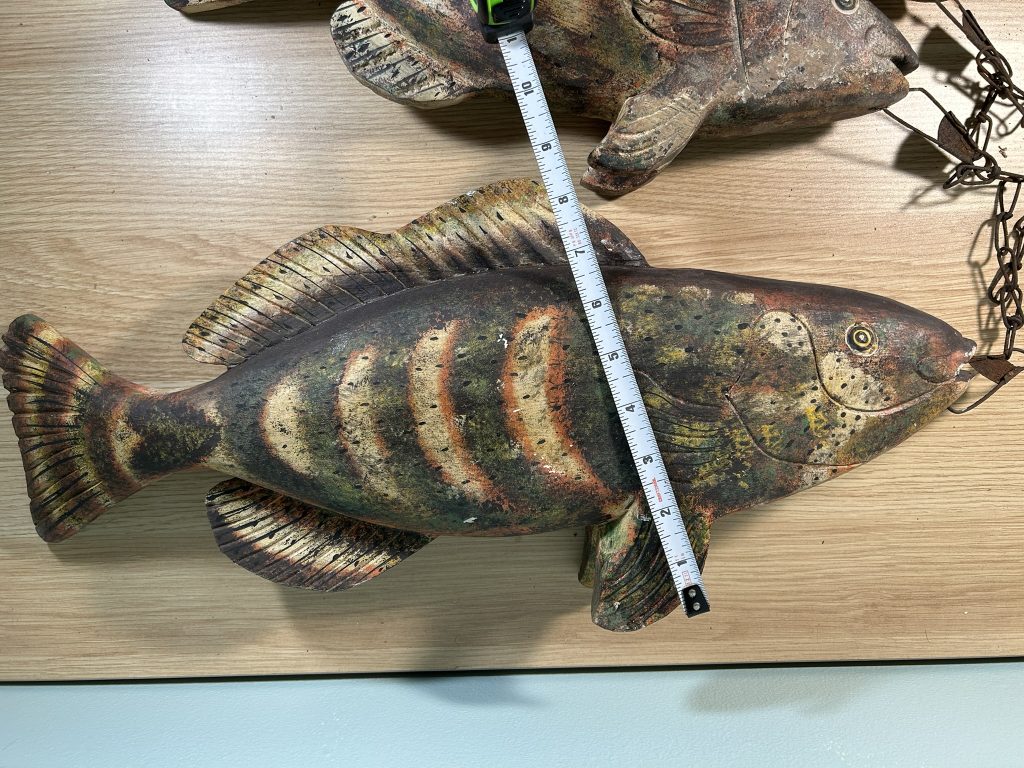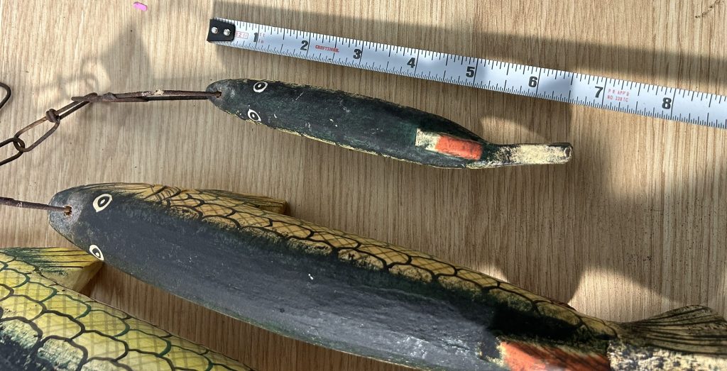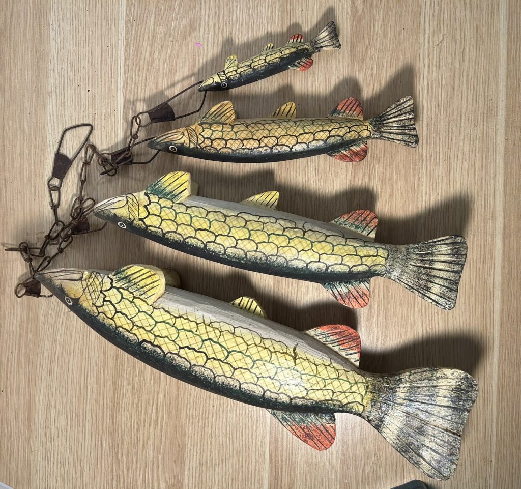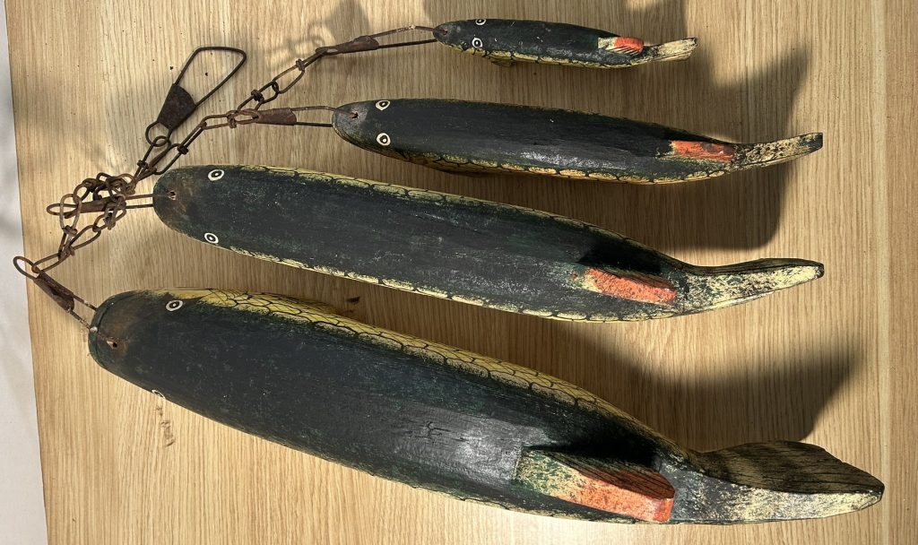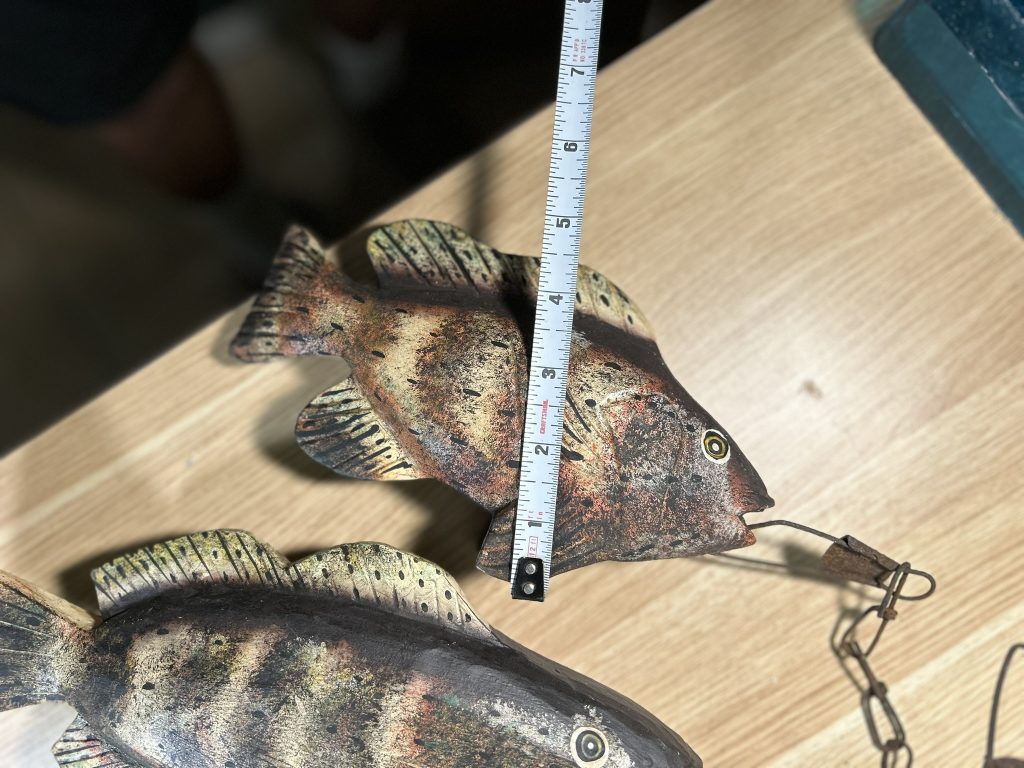 These wooden fish originate from Indonesia. They are hand painted.These were found at an auction in Georgia and although the date they were made is unknown, they are assumed to be old in view of the rusted fishing chains that hold them together. All together, about 20 different sets of fish are available. These would be a great gift for a fisherman in the family. I gave a set to my son after we went out fishing for a day and caught nothing. He was not amused.