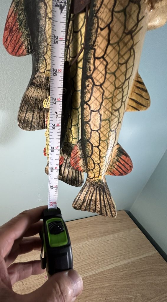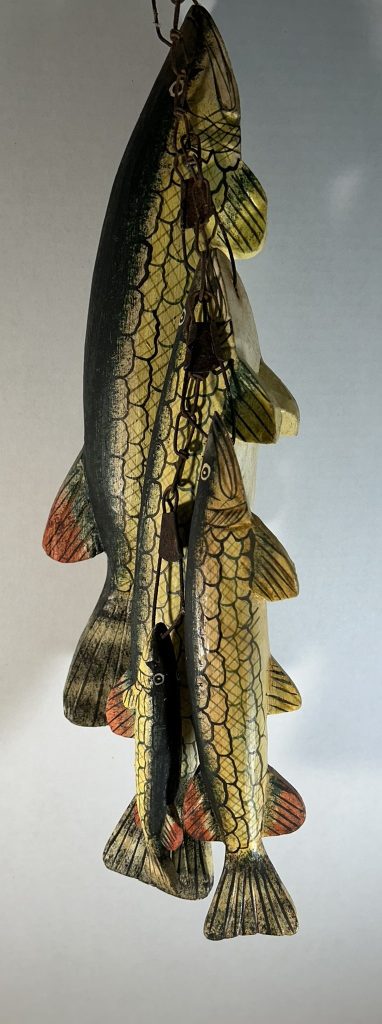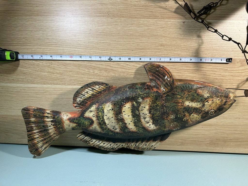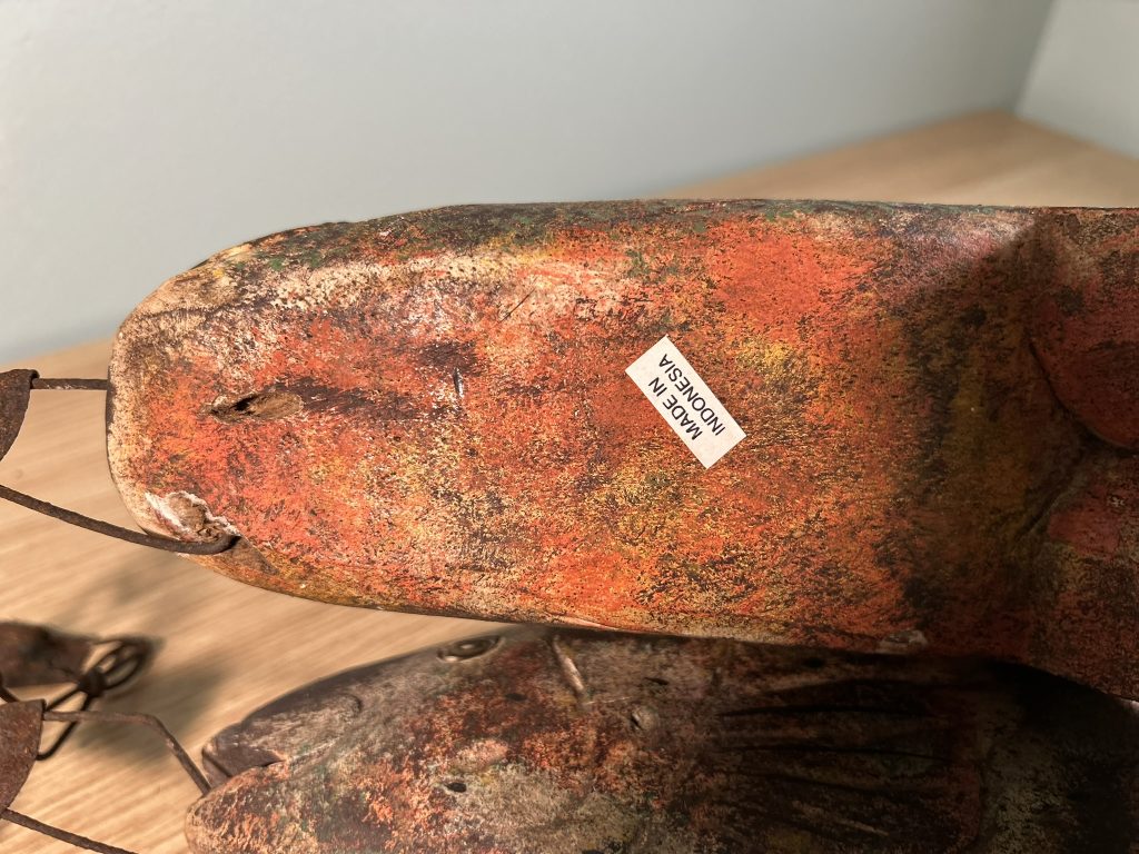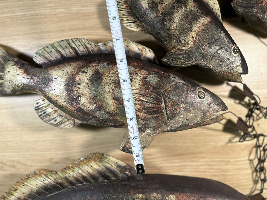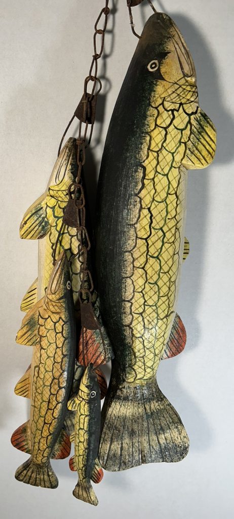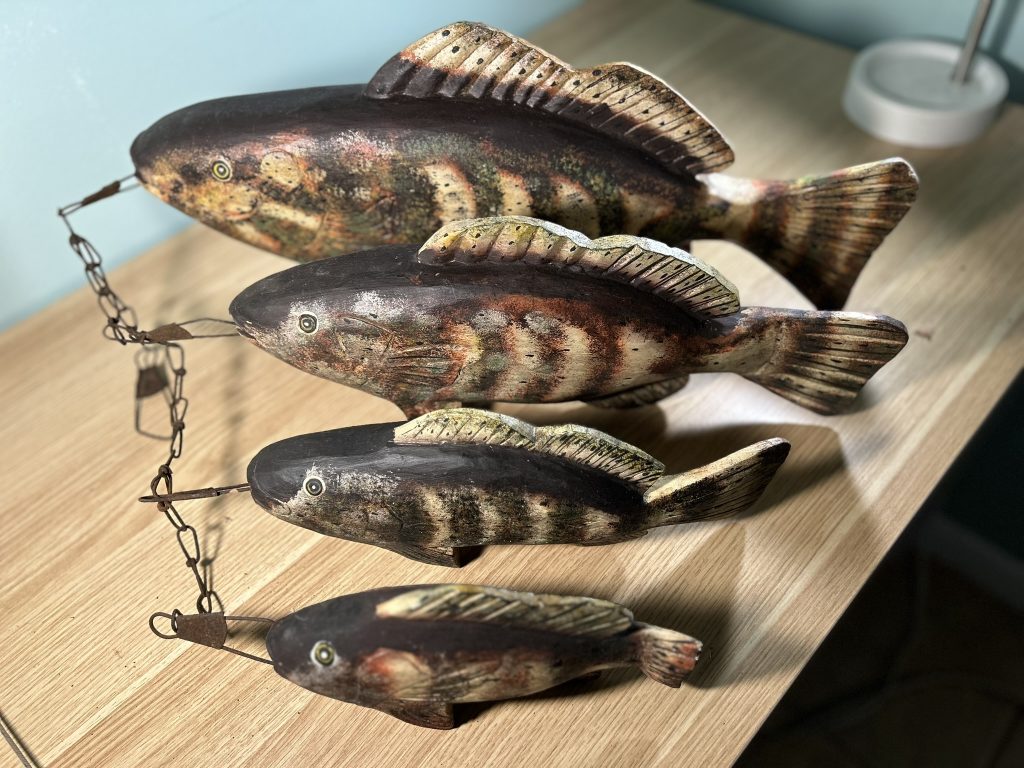 These wooden fish originate from Indonesia. They are hand painted.These were found at an auction in Georgia and although the date they were made is unknown, they are assumed to be old in view of the rusted fishing chains that hold them together. All together, about 20 different sets of fish are available. These would be a great gift for a fisherman in the family. I gave a set to my son after we went out fishing for a day and caught nothing. He was not amused.
