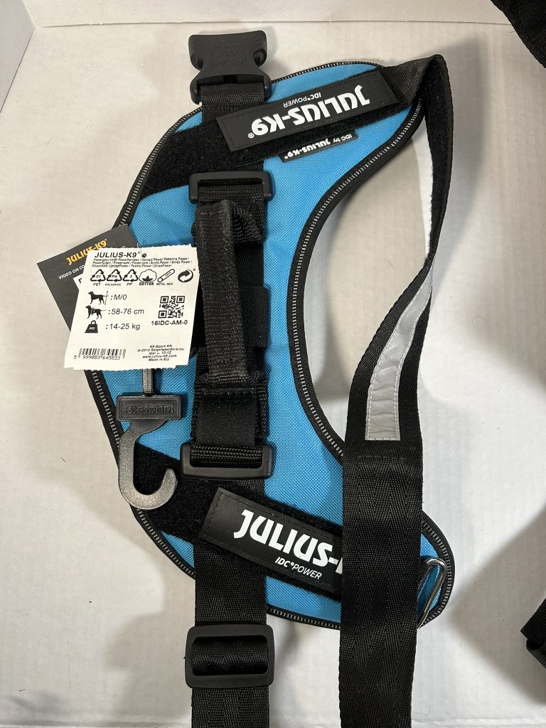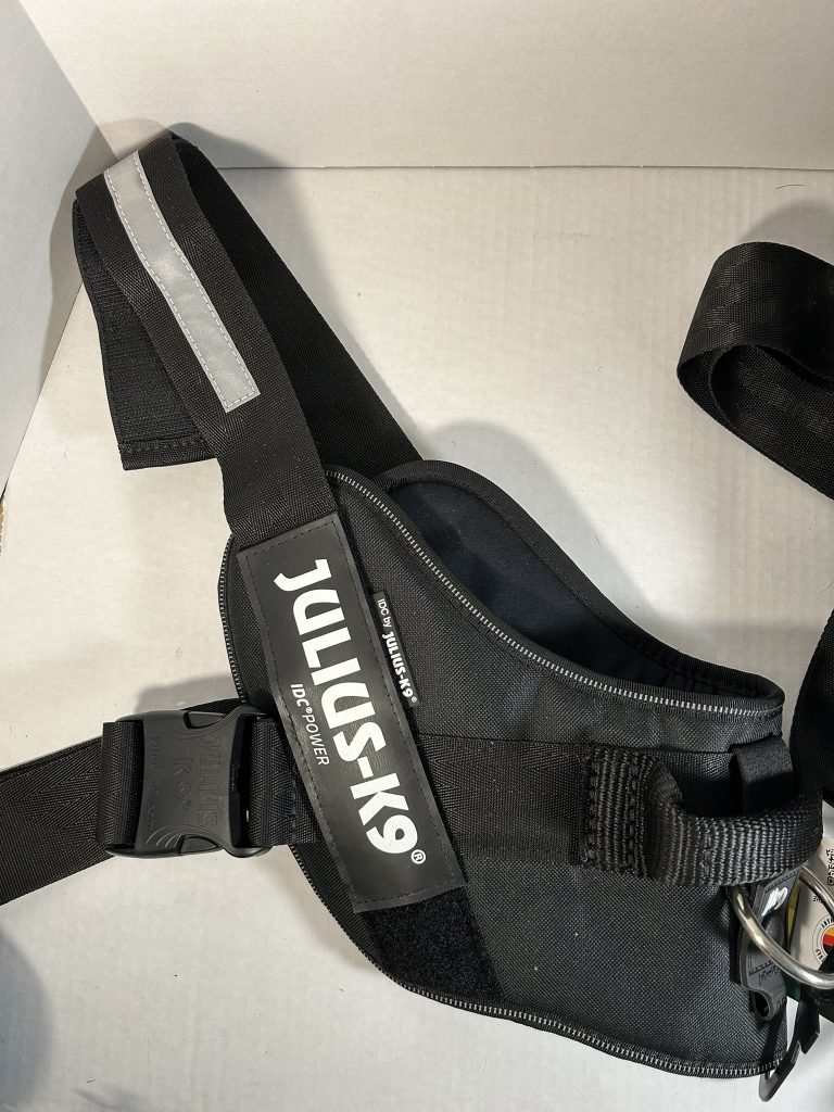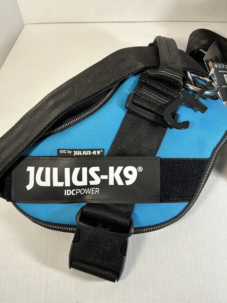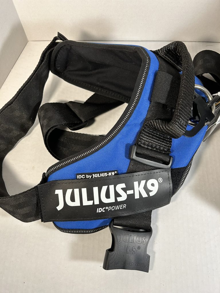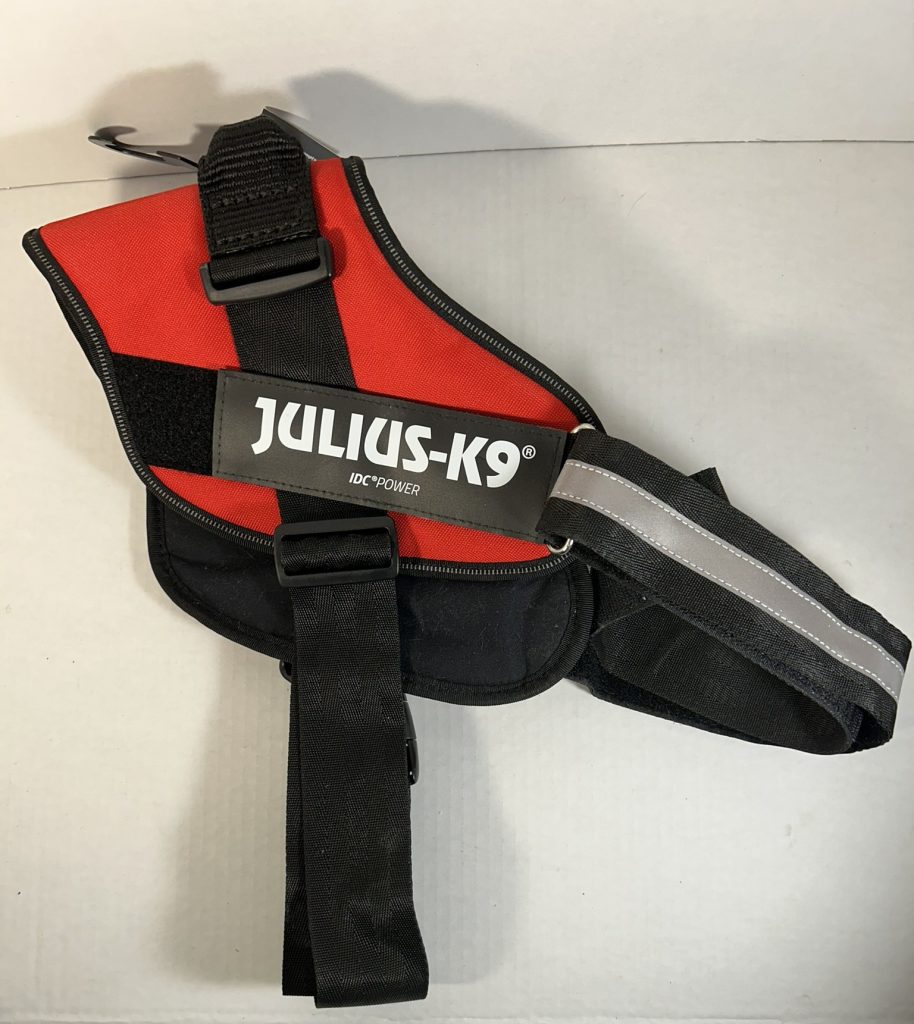 Julius Harnesses are generally more expensive than other harnesses but are chosen because they are very sturdy made of heavy-duty, quality fabric and strong metal rings. The buckles are strong enough to withstand pulling. These harnesses slip on over the neck of a dog and are easy to attach with just one buckle. They are frequently used by law enforcement, military, and professional trainers reportedly due to their reliability and control features. Control features include a built in grab handle to hold the dog close and securely and the chest strap which is aligned parallel to your leash, allowing for maximum power transmission with minimal effort. The harness distributes pulling force evenly across the dog’s torso, reducing pressure on the neck.