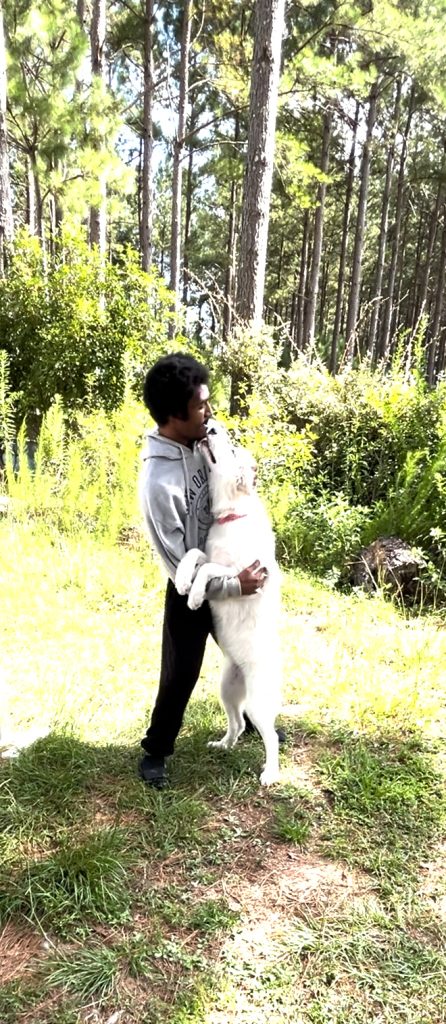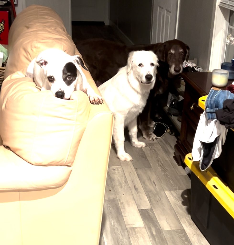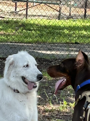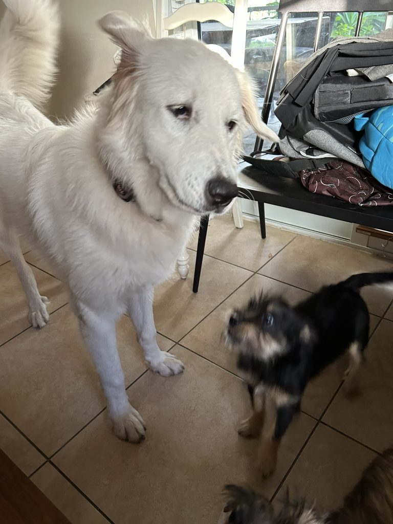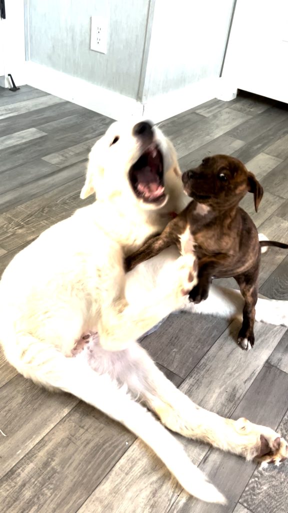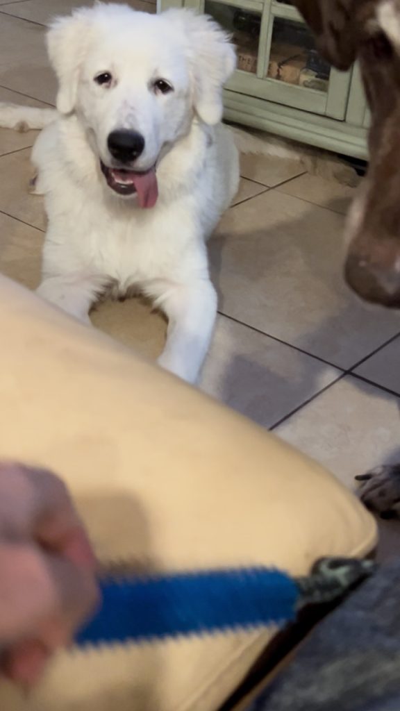This is my new friend Luna. By the way, my pop finally googled me. He found out that I am a barker (neighbors don’t like that), when I paw him I want a hug, and when I lean on him it’s because I am too big to get into his lap like I did when I was a baby. Google AI gave away all my secrets – for free. Im not telling Mr. Google anything anymore!