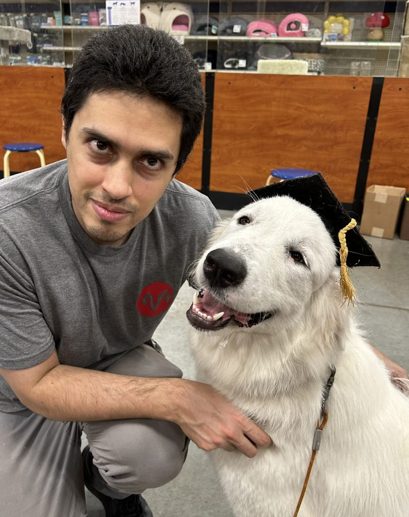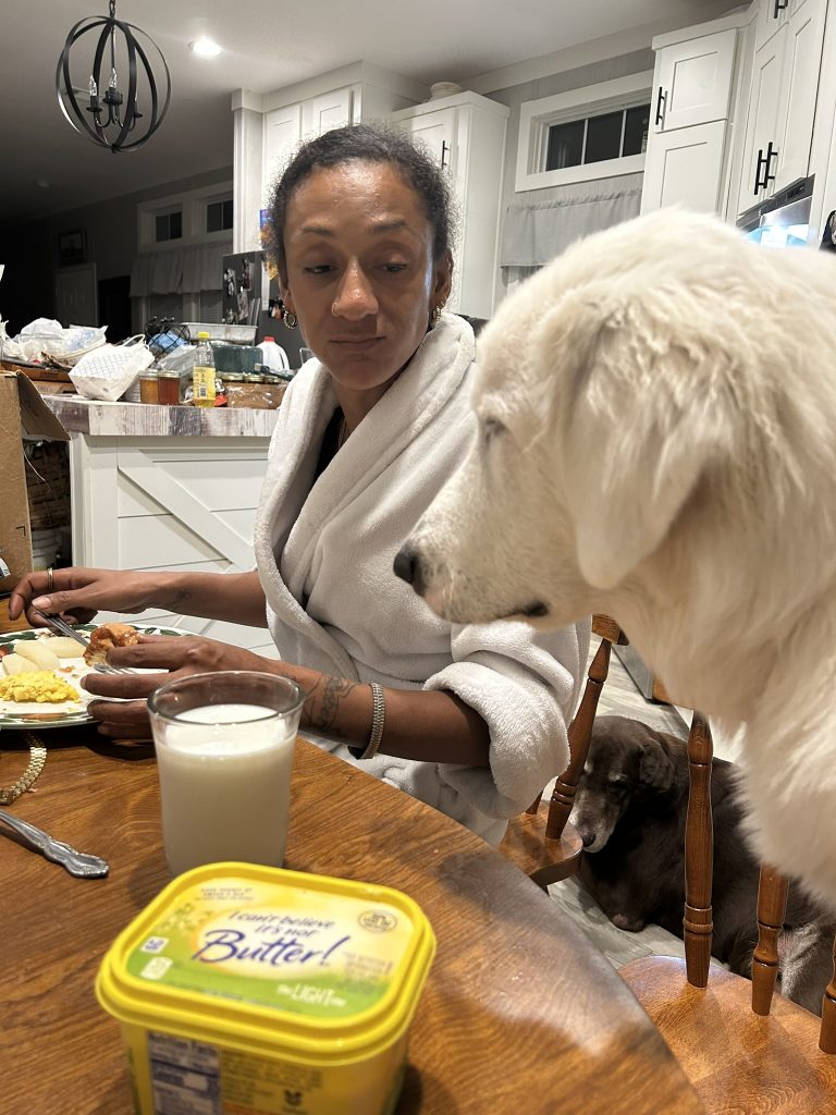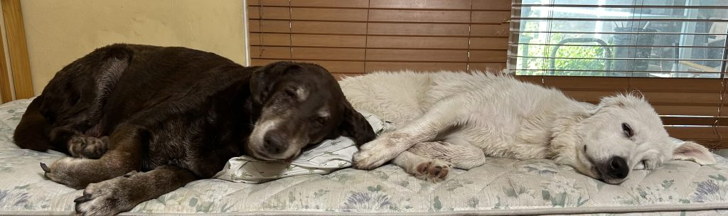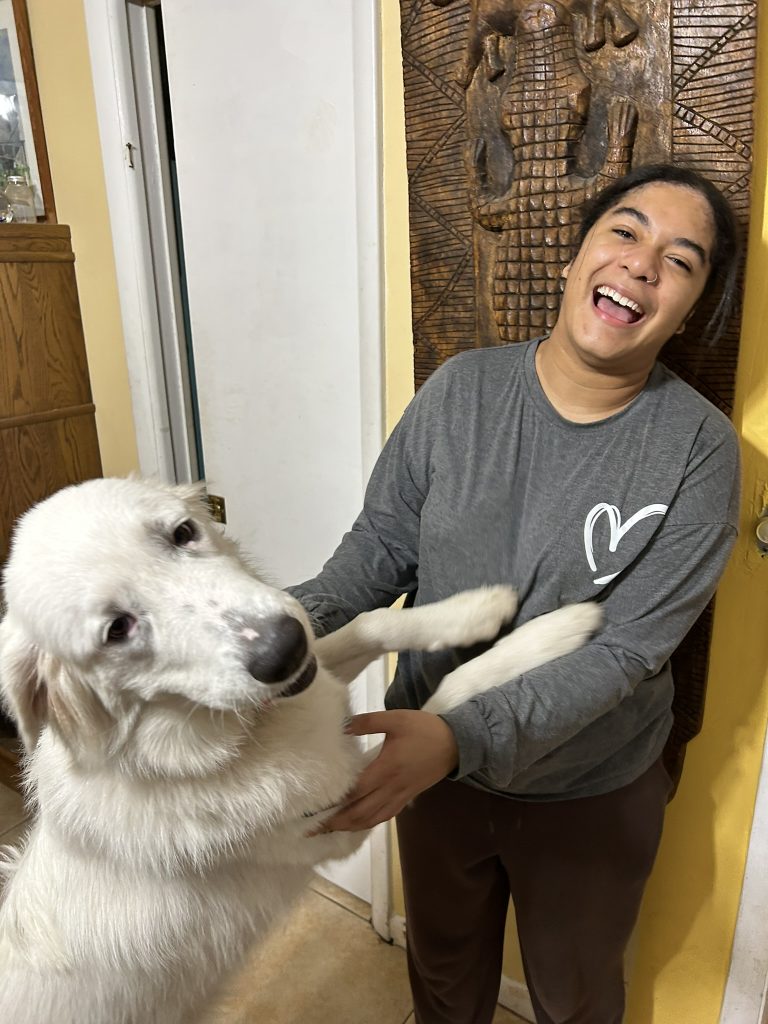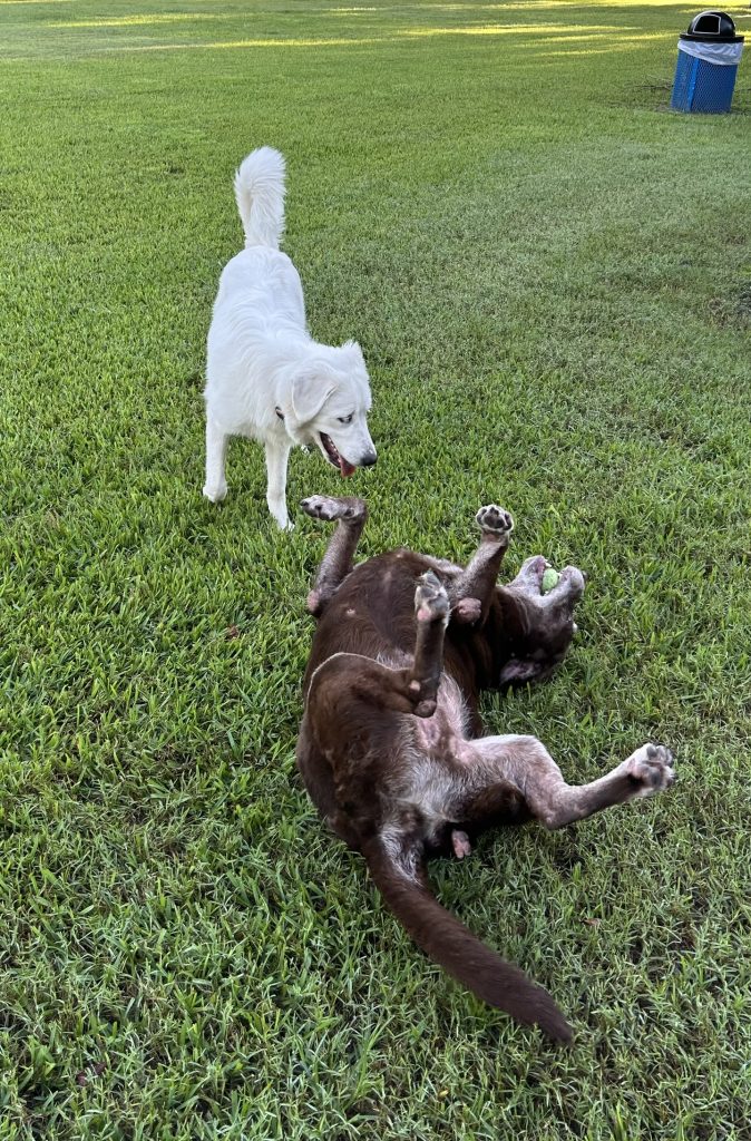 This is my new friend Luna. By the way, my pop finally googled me. He found out that I am a barker (neighbors don’t like that), when I paw him I want a hug, and when I lean on him it’s because I am too big to get into his lap like I did when I was a baby. Google AI gave away all my secrets – for free. Im not telling Mr. Google anything anymore!