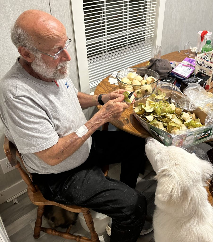 I’m helping pop peel pears for canning. He peels and I eat the pear cores 7 August