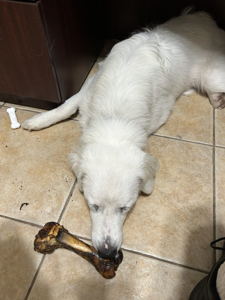 Pop has gone crazy. He went to an auction at a pet store and bought all sorts of things. He bought a slew of dog bones that he is going to try and sell on Facebook marketplace. He wants me to be his dog agent. Will someone please talk to him? This is a porcine femur. $3 for one. $10 for 4. Big beef bones (for Jewish dogs) are $5 each or 3 for $12